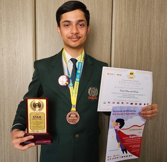 ” Harit is 14 years old and studying in Delhi Private School in Dubai. He is very much passionate about chess, Legos and cricket. He is hard-working and dedicated towards his goals. He thoroughly enjoys his practice sessions with Girish Reddy sir. Under his guidance, his chess skills have developed a lot. In school, he is getting good recognition. He participated in an inter-house competition at his school where he played 2 games and won both games, his house was in first place. He watches lots of videos of Magnus, Vishvanathan and Gukesh to learn new tricks and skills from them. His enthusiasm and hard work make him shine.”
