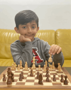 “Aadhvik has been interested in chess since a young age and enjoys watching chess videos and talking about chess. He loves his class and looks forward to the last class every month where the students choose the topic..”