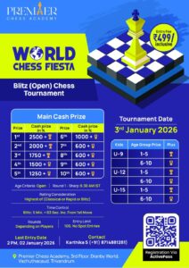 Premier Chess Academy presents World Chess Fiesta, a thrilling Blitz Open Chess Tournament on 3rd January 2026. Compete for exciting cash prizes and age-group awards in a fast-paced 5+3 format. Open to all skill levels with limited entries. Register now and experience competitive chess at its best in Trivandrum.
